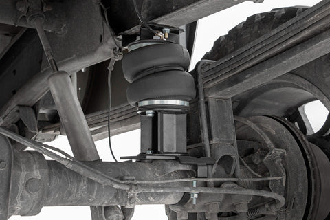 Ideal Leveling: Is your truck your workhorse? The main attraction of a pickup is the ability to haul and tow as needed. However, due to the weight in the bed or the condition of the rear leaf springs, your vehicle may become un-level under load. At Rough Country, we've designed a solution to eliminate these concerns. Introducing Rough Country's Rear Air Spring Kit.Heavy-Duty Construction: Rough Country's Rear Air Spring Kit includes two high-quality, double convoluted air bags, reinforced with durable powder-coated steel brackets and DOT-approved airlines. Whether you're towing a trailer or hauling heavy loads, this kit helps ensure your vehicle remains level, alleviating the strain on your trailer's tongue weight. The kit features 1/4"; push-to-connect air fittings for easy installation, along with all necessary bracketry for a secure fit. Rough Country's Air Spring Kit supports up to 5,000 lbs of load, minimizing sway and preventing bottoming out while braking and steering.Easy Installation: Quick and simple setup for immediate use. Rough Country's kit can be installed at home with standard tools in just 5-6 hours, ensuring minimal downtime and fast, hassle-free installation.Onboard Air Compressor and Wireless Controller: For added convenience, Rough Country offers an optional onboard air compressor and wireless controller to easily adjust your air spring kit on the go. Control air pressure at the push of a button from the comfort of your vehicle.Reliable Warranty Coverage: Rough Country's Rear Air Spring Kit includes a limited lifetime warranty on the air springs and a two-year replacement warranty on the compressor, offering lasting protection against manufacturer defects. This industry-leading coverage ensures confidence in both quality and durability, so you can count on Rough Country to keep your truck performing at its best.