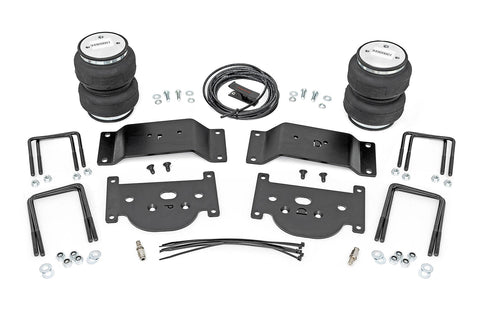 Ideal Leveling: Is your truck your workhorse? The main attraction of a pickup is the ability to haul and tow as needed. However, due to the weight in the bed or the condition of the rear leaf springs, your vehicle may become un-level under load. At Rough Country, we've designed a solution to eliminate these concerns. Introducing Rough Country's Rear Air Spring Kit.Heavy-Duty Construction: Rough Country's Rear Air Spring Kit includes two high-quality, double convoluted air bags, reinforced with durable powder-coated steel brackets and DOT-approved airlines. Whether you're towing a trailer or hauling heavy loads, this kit helps ensure your vehicle remains level, alleviating the strain on your trailer's tongue weight. The kit features 1/4"; push-to-connect air fittings for easy installation, along with all necessary bracketry for a secure fit. Rough Country's Air Spring Kit supports up to 5,000 lbs of load, minimizing sway and preventing bottoming out while braking and steering.Easy Installation: Quick and simple setup for immediate use. Rough Country's kit can be installed at home with standard tools in just 5-6 hours, ensuring minimal downtime and fast, hassle-free installation.Onboard Air Compressor and Wireless Controller: For added convenience, Rough Country offers an optional onboard air compressor and wireless controller to easily adjust your air spring kit on the go. Control air pressure at the push of a button from the comfort of your vehicle.Reliable Warranty Coverage: Rough Country's Rear Air Spring Kit includes a limited lifetime warranty on the air springs and a two-year replacement warranty on the compressor, offering lasting protection against manufacturer defects. This industry-leading coverage ensures confidence in both quality and durability, so you can count on Rough Country to keep your truck performing at its best.