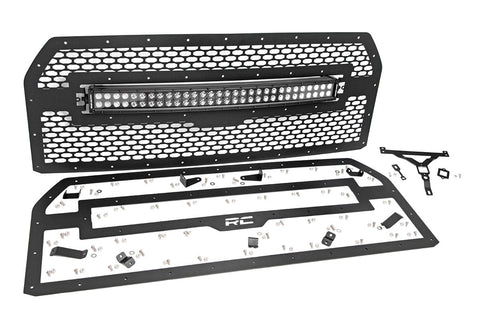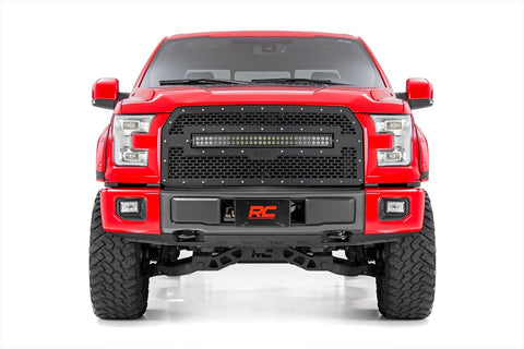 Give the front-end of your Ford F-150 a unique look with Rough Country'sMesh Grille kit! This easy to install grille replacement kit swaps out your stock grille with the eye-catching, head-turning good looks of this aftermarket upgrade. With a unique, laser-cut mesh pattern surrounded by stylish, stainless steel rivets, this grill gives your truck a more menacing look that's sure to draw attention.This kit features a Rough Country's 30 Curved Dual-Row Black-Series LED light bar with Cree LED's outputting a staggering 14,400 Lumens and 180 Watts of lighting power. Includes a mountable on/off switch, wiring harness, and our 3 Year LED Warranty!This easy-to-install grille requires no cutting or drilling and can be returned to stock at any time. Each kit is powdercoated black to resist corrosion and give a long lifespan of good looks. This kit also allows you to retain your active grille shutter system and front camera and features Rough Country'sLifetime Replacement Warranty!