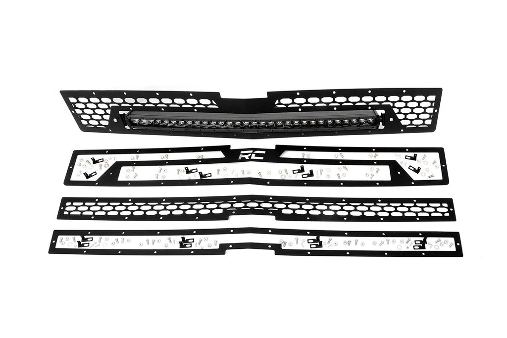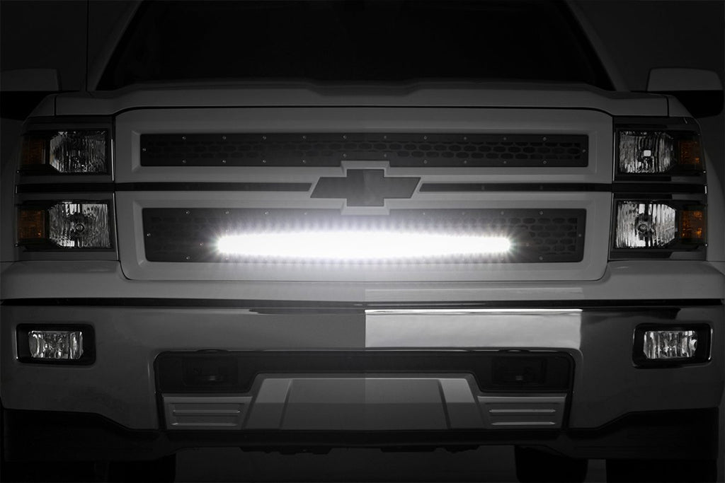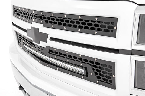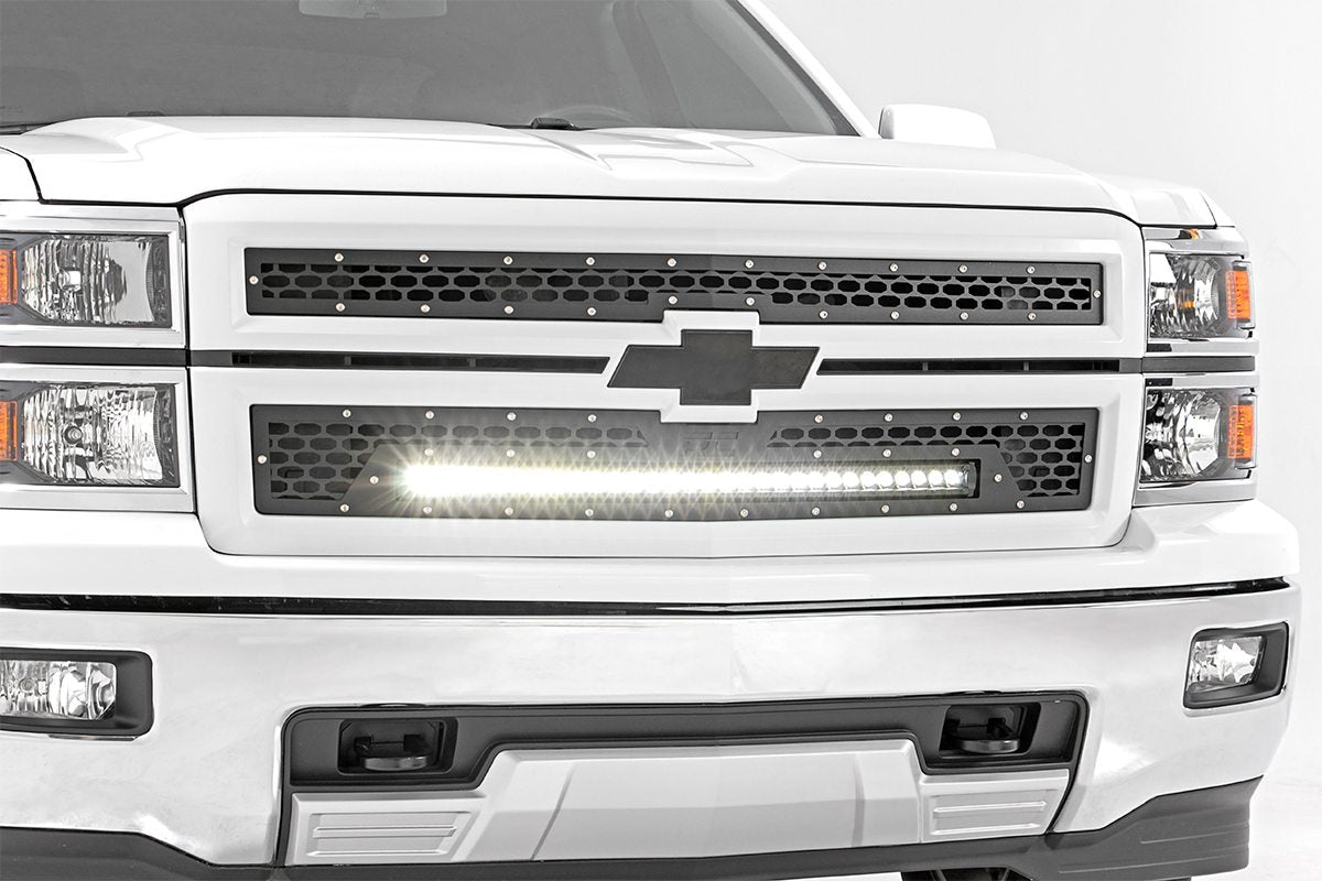 Give the front-end of your 14-15 Chevy 1500 a unique look with Rough Country'sMesh Grille kit. This grille replacement kit swaps out your stock grille with the eye-catching, head-turning good looks of this aftermarket upgrade. With a unique, laser-cut mesh pattern surrounded by stylish, stainless steel button-head bolts, this grill gives your truck a more menacing look that's sure to draw attention. Each kit is powder coated black to resist corrosion and give a long lifespan of good looks!This kit features a Rough Country's 30 Curved Single-Row Black-Series LED light bar with Cree LED's outputting a staggering 12,000 Lumens and 150 Watts of lighting power. Includes a mountable on/off switch, wiring harness, and our 3 Year Warranty!