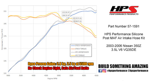 Without any re-tuning, the HPS silicone post MAF air intake tube delivers dyno-proven performance gains +5.9 Whp, +5.5 Ft/lbs