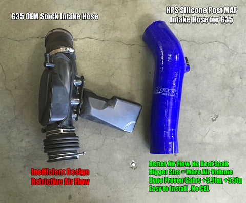 Infiniti 03-06 G35 Sedan 3.5L V6 HPS Red Silicone Air Intake Hose Post MAF Tube replaces the stock OEM restrictive hose with high temp reinforced silicon material. Unlike other aftermarket air intake kits, HPS post MAF silicone hoses improve air flow and reduce heat soak while keeping the stock well designed air box perform at high efficient level. Without any re-tuning, the HPS silicone post MAF air intake Tube deliver dyno-proven performance gains of +5.9 Whp, +5.5 Ft/Lbs. This product fits Infiniti 2003-2006 G35 Sedan 3.5L V6.