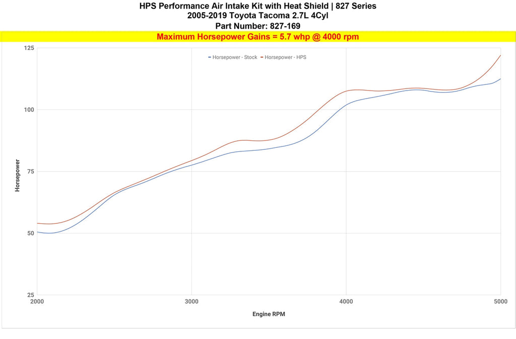 The All-New HPS Performance 827 Series Air Intake Kit (Polish, Part # 827-169P) for 2005-2022 Toyota Tacoma 2.7L offers a free-flowing 2-3/4 inch mandrel-bent aluminum tube induction system designed to produce dyno proven performance gains - increase horsepower +5.7 whp , torque +7.4 ft/lbs and improve throttle response while maintaining safe air fuel ratio. The heavy duty powder coated steel heat shield blocks hot air from the air filter for the best cooling effect. The included installation manual has clear pictures and instructions to guide the installer throughout the whole process. The kit does NOT require tuning and does not trigger CEL light. No modification is required during the installation. HPS light weight mandrel-bent aluminum alloy tube replaces the stock restrictive air box and optimize the air flow with excellent heat dissipation and long lasting durability. HPS Performance 827 Series air intake kit features race proven reinforced silicone hoses and industrial grade 100% stainless steel T-bolt clamps which ensures reliability, even during the most extreme driving conditions. The All-New HPS Performance Air Filter is designed with performance in mind, delivering excellent filtration without sacrificing air flow. All HPS Performance Air filter are made in the United States.