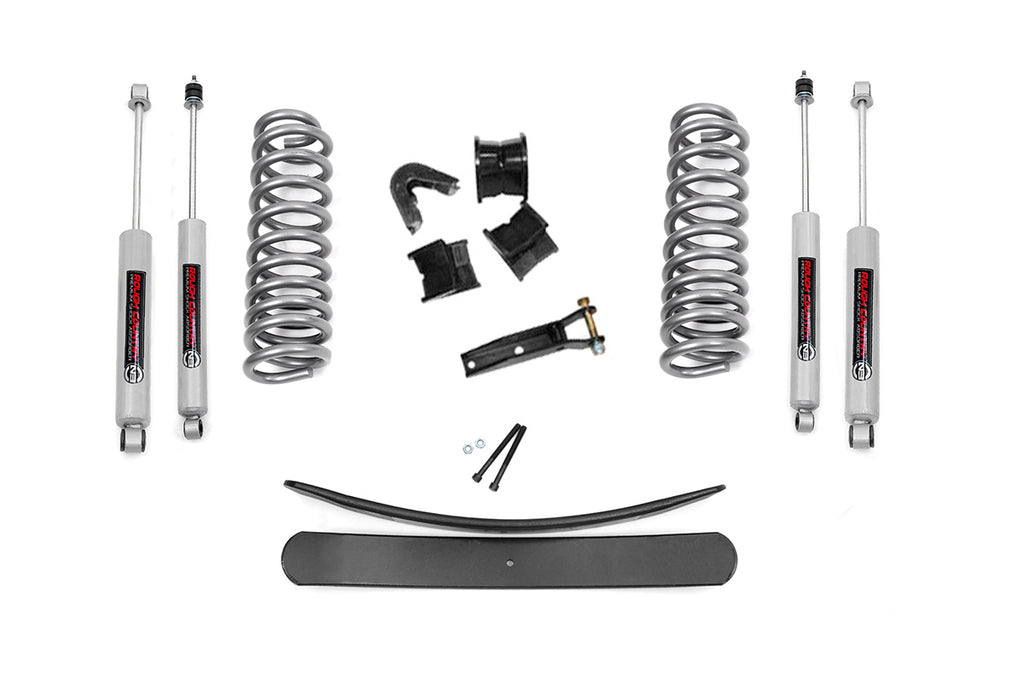 Aggressive Stance, Front to Back: Transform your Ford's appearance with Rough Country's 2.5"; Suspension Lift Kit, designed to raise the front end for a leveled, flush stance. Eliminate the factory rake and give your truck a commanding profile that looks as good as it performs.Durable Coil Springs for a Confident Ride: This system includes a pair of heavy-duty front coil springs engineered to increase ride height without compromising ride quality. Paired with 4-degree C-bushings and a track bar drop bracket, the kit maintains proper suspension geometry and a factory-like ride feel.Smooth Performance with Premium N3 Shocks: Enjoy the perfect balance of highway comfort and off-road control with Rough Country's nitrogen-charged N3 shocks. These 10-stage, velocity-sensitive shocks feature a large 54mm shock body and 18mm spring-loaded piston rod for superior durability and consistent damping.Clearance for Up to 33-Inch Tires: Gain the extra height needed to run up to 33" tires, giving your Ford a bolder look and enhanced trail capability, with the proper wheel backspacing.Backed by Confidence: Like all Rough Country suspension products, this 2.5"; lift kit is backed by our Limited Lifetime Replacement Warranty for peace of mind on every adventure.