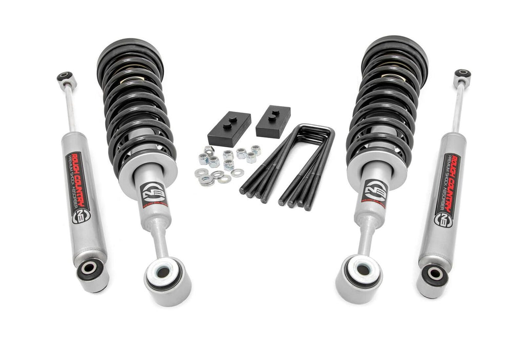 Elevate Your F-150 with Confidence: Rough Country's 2.5-Inch Lift Kit delivers the perfect blend of bold looks, premium strength, and off-road capability. Gain 2.5 inches of lift for enhanced clearance while preserving the comfort and stance of your factory ride.Effortless Bolt-On Installation: Get back on the road faster with a 100% bolt-on design that requires no cutting or welding. This kit installs easily with common tools, making it a hassle-free upgrade for weekend wrenchers and pros alike.Smooth OEM Ride Quality: Engineered for comfort, this kit maintains the smooth and responsive factory ride you love. Enjoy improved clearance without sacrificing the feel of your daily drive.Boosted Ground Clearance: Conquer trails, rocks, and rough terrain with added ground clearance. This kit is your gateway to fitting up to 33-inch tires for a tougher, trail-ready look and performance.Balanced Factory Stance: This kit includes a rear lift block to maintain your F-150's factory rake, giving you a level, balanced appearance without compromising the original design.Includes Rough Country's N3 Loaded Struts and Rear Shocks: This kit comes complete with Rough Country's N3 loaded struts up front and N3 rear shocks in the back for enhanced ride quality and improved suspension performance. These premium components are engineered to deliver superior damping, increased stability, and all-terrain comfort, making your F-150 ready for any adventure right out of the box.