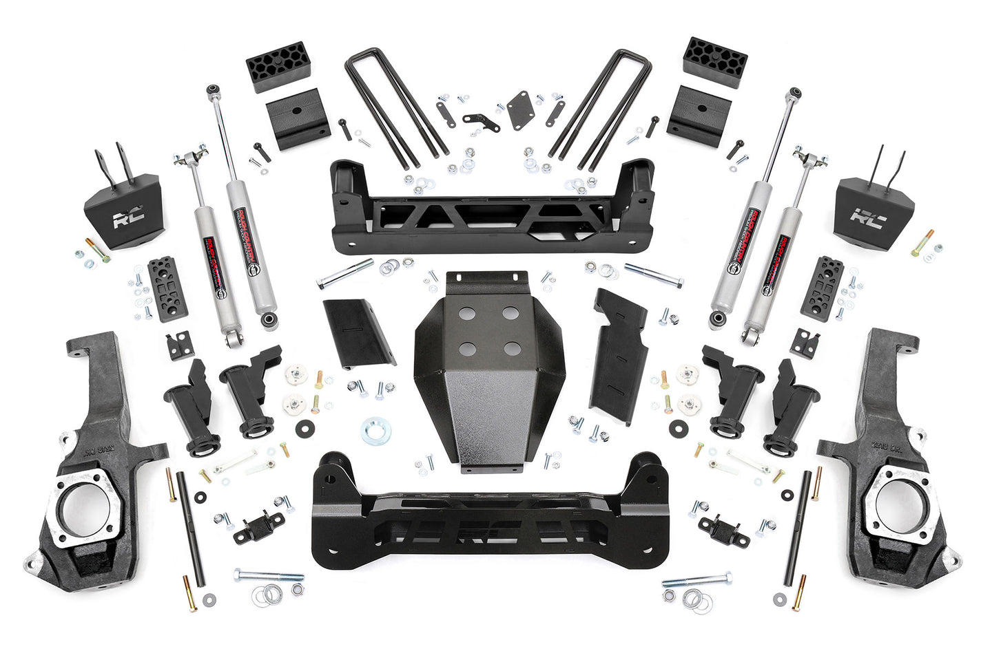 Straight from the lot, the GM 2500HD/3500HD boasts an aggressive stance and sleek design. Inspired by its bold presence, Rough Country developed a suspension kit that enhances its performance without compromising its sharp aesthetics. The 5"; Suspension Lift for GM 2500HD/3500HD incorporates a Torsion Drop Design that improves ride quality and handling while maintaining factory angles for a smooth, balanced drive.Torsion Drop Design: Provides improved ride quality and handling, while preserving factory angles for a smooth and controlled drive.Heavy Duty Components: Features 1/4"; thick steel crossmembers, Torsion Bar Drop Brackets, and a rugged skid plate, all laser-cut and powder-coated in ";Hammer Black"; to match factory components.No Drilling or Differential Modifications Required: Install with ease, no invasive modifications needed to maintain the integrity of your truck.Precision Fitment: Designed to preserve the factory ride feel and handling without widening the track width, ensuring your GM 2500 HD stays sharp around corners.Customizable Shock Options: Choose from a range of high-performance shock options, including our nitrogen-charged N3 shocks, V2 monotube shocks, M1 monotube shocks, and adjustable Vertex shocks. The power to select the right shock series for your needs is in your hands.Rough Country's 5"; Suspension Lift doesn't just look like it came off the showroom floor, it feels like it too. Achieve the perfect balance of strength, style, and smooth handling with this innovative lift kit, designed specifically to complement your GM 2500HD/3500HD.