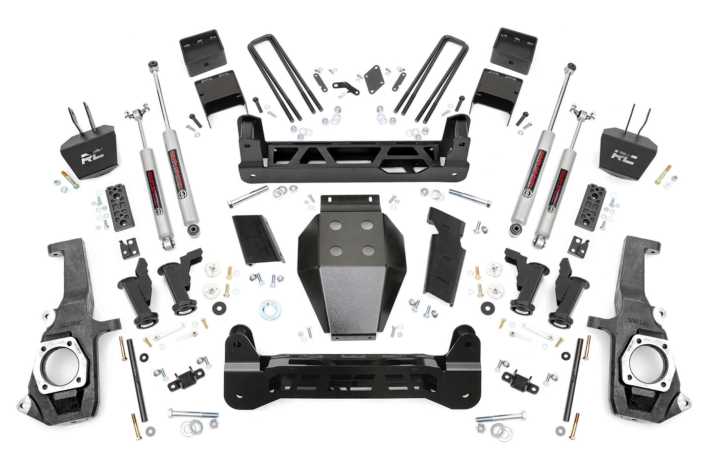 Straight from the lot, the GM 2500HD/3500HD boasts an aggressive stance and sleek design. Inspired by its bold presence, Rough Country developed a suspension kit that enhances its performance without compromising its sharp aesthetics. The 7.5"; Suspension Lift for GM 2500HD/3500HD incorporates a Torsion Drop Design that improves ride quality and handling while maintaining factory angles for a smooth, balanced drive.Torsion Drop Design: Provides improved ride quality and handling, while preserving factory angles for a smooth and controlled drive.Heavy Duty Components: Features 1/4"; thick steel crossmembers, Torsion Bar Drop Brackets, and a rugged skid plate, all laser-cut and powder-coated in ";Hammer Black"; to match factory components.No Drilling or Differential Modifications Required: Install with ease, no invasive modifications needed to maintain the integrity of your truck.Precision Fitment: Designed to preserve the factory ride feel and handling without widening the track width, ensuring your GM 2500 HD stays sharp around corners.Customizable Shock Options: Choose from a range of high-performance shock options, including our nitrogen-charged N3 shocks, V2 monotube shocks, M1 monotube shocks, and adjustable Vertex shocks. The power to select the right shock series for your needs is in your hands.Rough Country's 7.5"; Suspension Lift doesn't just look like it came off the showroom floor, it feels like it too. Achieve the perfect balance of strength, style, and smooth handling with this innovative lift kit, designed specifically to complement your GM 2500HD/3500HD.