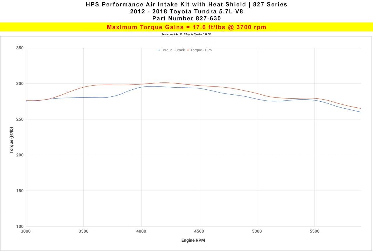 The All-New HPS Performance 827 Series Air Intake Kit (Black, Part # 827-630WB) for 2012-2019 Toyota Tundra 5.7L V8 offers a free-flowing 4 inch mandrel-bent aluminum tube induction system designed to produce dyno proven performance gains - increase horsepower +12.4 whp , torque +17.6 ft/lbs and improve throttle response while maintaining safe air fuel ratio. The heavy duty powder coated steel heat shield blocks hot air from the air filter for the best cooling effect. The included installation manual has clear pictures and instructions to guide the installer throughout the whole process. The kit does NOT require tuning and does not trigger CEL light. No modification is required during the installation. HPS light weight mandrel-bent aluminum alloy tube replaces the stock restrictive air box and optimize the air flow with excellent heat dissipation and long lasting durability. HPS Performance 827 Series air intake kit features race proven reinforced silicone hoses and industrial grade 100% stainless steel T-bolt clamps which ensures reliability, even during the most extreme driving conditions. The All-New HPS Performance Air Filter is designed with performance in mind, delivering excellent filtration without sacrificing air flow. All HPS Performance Air filter are made in the United States.