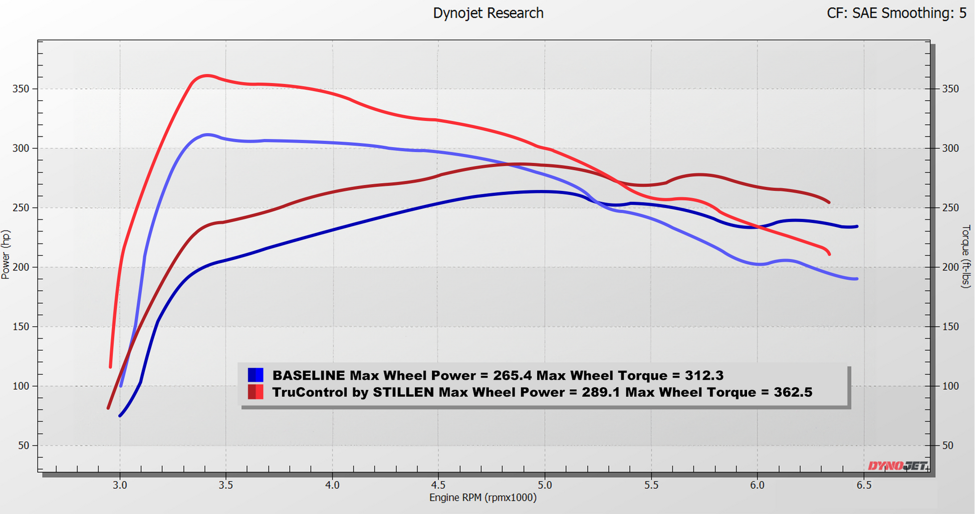 In terms of torque increases, our TruControl truly excels. The stock dyno indicated a maximum torque of 312 ft lbs. Yet, with the TruControl by STILLEN Inline Power Module in place, our test Bronco showcased a remarkable increase, delivering in excess of 362 ft. lbs of torque*. The most significant surge over stock figures occurred towards the lower RPM range, with an additional 50 ft lbs recorded at the wheels!