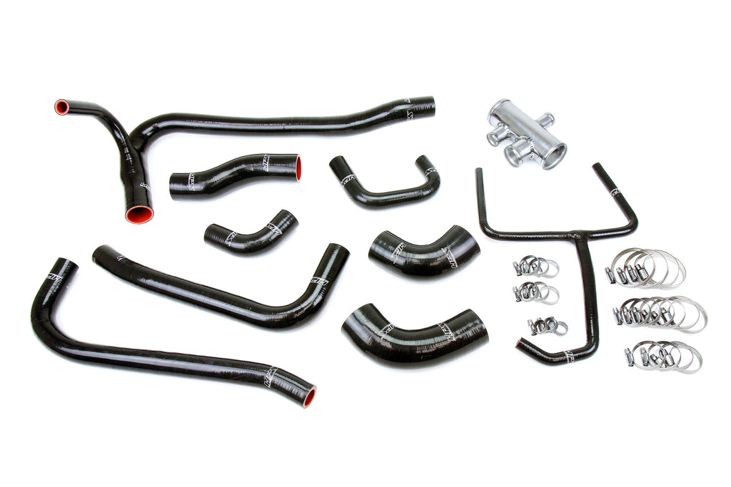The HPS High Temp 3-ply Reinforced Silicone Coolant Hose Kit is designed to replace stock OEM rubber upper and lower radiator, upper bypass, and coolant expansion tank hoses which can eventually weaken over time, leading to premature failure. With premium quality silicone and racing inspired design, this silicone hose kit can withstand the harsh high temperature and high pressure operating conditions of the engine yet still maintain peak efficiency during competition or daily driving. This silicone radiator hose kit features a 5-way aluminum joiner to connect the lower radiator hose branches. The aluminum joiner is significantly stronger than the stock plastic part, reducing the chances for failure in your cooling system. HPS silicone hose kits have all the correct bends and sizes for a perfect fit replacement for your OEM rubber coolant hoses. Compared to the universal hoses you can get from the local auto store, HPS silicone hose kits are much easier to work with. Maximum temperature rating: 350 degrees Fahrenheit. 100% stainless steel clamps are included for easy installation.