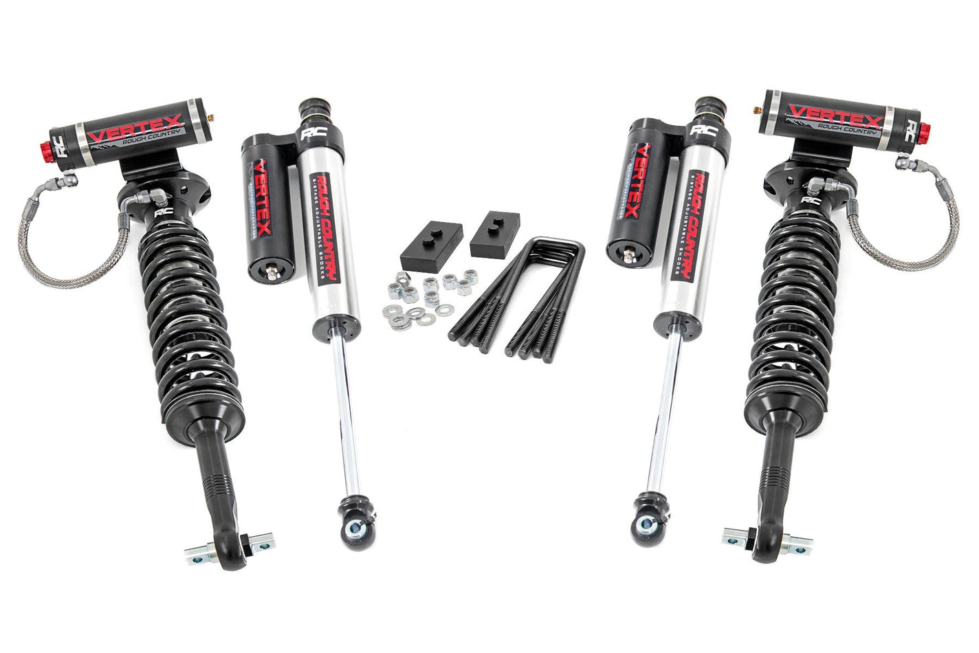 Elevate Your F-150 with Confidence: Rough Country's 2-Inch Lift Kit delivers the perfect blend of bold looks, premium strength, and off-road capability. Gain 2 inches of lift for enhanced clearance while preserving the comfort and stance of your factory ride.Effortless Bolt-On Installation: Get back on the road faster with a 100% bolt-on design that requires no cutting or welding. This kit installs easily with common tools, making it a hassle-free upgrade for weekend wrenchers and pros alike.Smooth OEM Ride Quality: Engineered for comfort, this kit maintains the smooth and responsive factory ride you love. Enjoy improved clearance without sacrificing the feel of your daily drive.Boosted Ground Clearance: Conquer trails, rocks, and rough terrain with added ground clearance. This kit is your gateway to fitting up to 33-inch tires for a tougher, trail-ready look and performance.Balanced Factory Stance: This kit includes a rear lift block to maintain your F-150's factory rake, giving you a level, balanced appearance without compromising the original design.Shock Options Built Around You: Whether you're going with our reliable nitrogen-charged N3 shocks or upgrading to the elite Vertex reservoir setup, this lift kit is fully compatible and ready to match your preferred ride quality.
