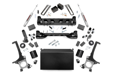you'll never look at a Tundra the same way after installing Rough Country's 6-inch Toyota Tundra kit. This all-inclusive kit is a total transformation for your truck, with durable lifted knuckles, protective skid plate, and all the brackets and hardware needed to set your truck to a factory-like geometry while providing additional ground clearance. The beefy front crossmember features a high-clearance design to help traverse off-road obstacles with no hang-ups.Run larger wheels and tires while giving your truck a one-of-a-kind look and exceptional off-road performance. This kit affords your truck an aggressive appearance and a higher profile that is sure to demand attention. This kit includes Rough Country'sNitrogen-charged N3 Shocks for the ultimate balance in highway ride quality and off-road vibration dampening. Includes Rough Country'sLifetime Replacement Guarantee.