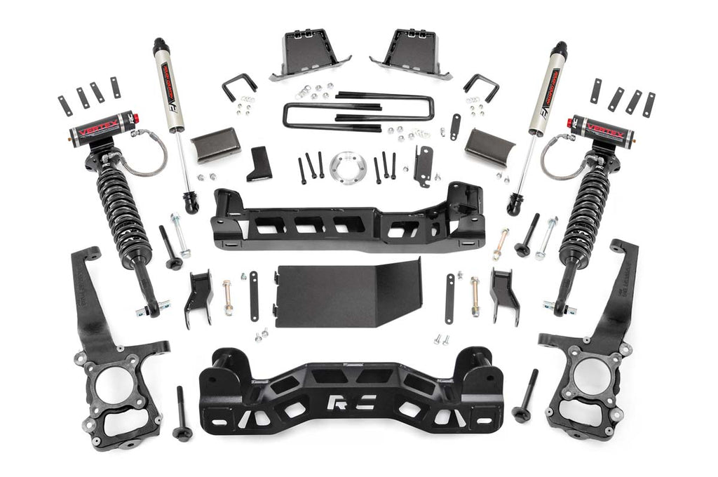 Commanding Lift, Premium Ride: Transform the look and capability of your 2014 Ford F-150 with Rough Country's 6-Inch Lift Kit. Engineered to deliver a bold, leveled stance, this kit not only increases ground clearance for rugged off-road performance but also makes room for larger tires and wheels. Whether you're cruising the highway or tackling backcountry trails, enjoy a smooth, confident ride with enhanced control and presence.Engineered for Strength and Stability: Built for serious performance, this kit features heavy-duty lifted knuckles, durable strut spacers, or your choice of lifted struts, all designed to maintain proper suspension geometry. Differential and sway-bar drop brackets, along with brake line extensions and a driveshaft spacer, ensure everything stays at factory-like angles. Massive 1/4-inch thick front and rear crossmembers offer uncompromised strength, laser-cut with the RC logo for a clean, aggressive look.Advanced Rear Block Design: Rough Country's 4-inch fabricated rear blocks are stronger and longer-lasting than traditional cast versions. Specially engineered anti-axle wrap blocks eliminate common lift-related issues while maintaining stock ride comfort. You get durability and drivability in one rugged package.Tailored Ride Performance: This kit includes Rough Country's premium N3 shocks-10-stage variable valving, nitrogen-charged for the perfect fusion of off-road performance and on-road comfort. Want more? It's fully configurable with Rough Country's full lineup of shocks and struts, including the high-performance Vertex reservoir upgrade.Limited Lifetime Replacement Warranty. Rough Country's Lift Kit is backed with a limited lifetime replacement warranty for manufacturer defects. As such, the product is protected from structural and workmanship damage after the date of purchase. With our industry-leading warranty, give yourself peace of mind when using Rough Country's Suspension products!