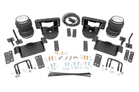 Ideal Leveling: Is your truck your workhorse? The main attraction of a pickup is the ability to haul and tow as needed. However, due to the weight in the bed or the condition of the rear leaf springs, your vehicle may become un-level under load. At Rough Country, we've designed a solution to eliminate these concerns. Introducing Rough Country's Rear Air Spring Kit.Heavy-Duty Construction: Rough Country's Rear Air Spring Kit includes two high-quality, double convoluted air bags, reinforced with durable powder-coated steel brackets and DOT-approved airlines. Whether you're towing a trailer or hauling heavy loads, this kit helps ensure your vehicle remains level, alleviating the strain on your trailer's tongue weight. The kit features 1/4"; push-to-connect air fittings for easy installation, along with all necessary bracketry for a secure fit. Rough Country's Air Spring Kit supports up to 5,000 lbs of load, minimizing sway and preventing bottoming out while braking and steering.Easy Installation: Quick and simple setup for immediate use. Rough Country's kit can be installed at home with standard tools in just 5-6 hours, ensuring minimal downtime and fast, hassle-free installation.Onboard Air Compressor and Wireless Controller: For added convenience, Rough Country offers an optional onboard air compressor and wireless controller to easily adjust your air spring kit on the go. Control air pressure at the push of a button from the comfort of your vehicle.Reliable Warranty Coverage: Rough Country's Rear Air Spring Kit includes a limited lifetime warranty on the air springs and a two-year replacement warranty on the compressor, offering lasting protection against manufacturer defects. This industry-leading coverage ensures confidence in both quality and durability, so you can count on Rough Country to keep your truck performing at its best.