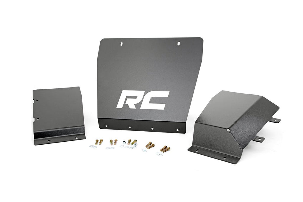 Armor up the underside of your GM 1500 with Rough Country's durable Skid Plate System. This easy-to-install kit is the perfect complement to our popular 5-inch, 6-inch and 7.5-inch Lifted Knuckle Suspension Kits for new model Chevy and GMC 1500's.Fear no hazard - on or off-road - with this 3-piece rugged skid-plate designed to shield your trucks differential, electric differential actuator, and electric rack and pinion components. Made of high-quality G80 3/16-inch steel, this full belly skid connects from the front cross member to the rear, offering a serious wall of protection from rocks, debris, and other hazards. The front plate features a laser-cut ";RC"; logo, providing a more aggressive look to the lower front end of your truck. Includes a Limited Lifetime Warranty!
