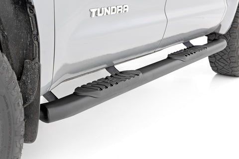 Gain easier access to your cab with the classic, OEM look of Rough Country'sOval Nerf Step Bars. These durable, steel side steps feature a comfortable, 4.5-inch wide stepping area built into a large, tubular nerf rail that mimics the look of the popular OEM oval step design.